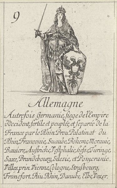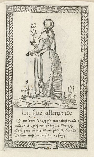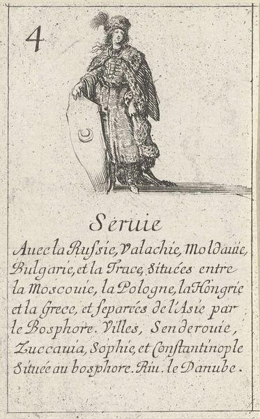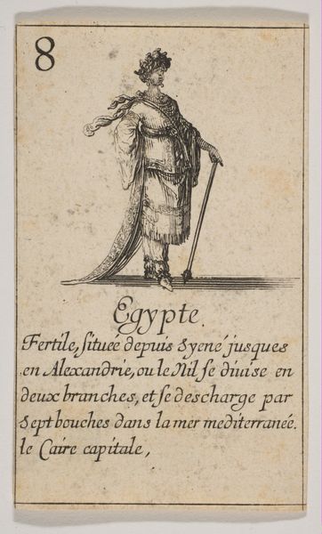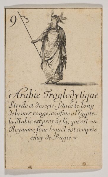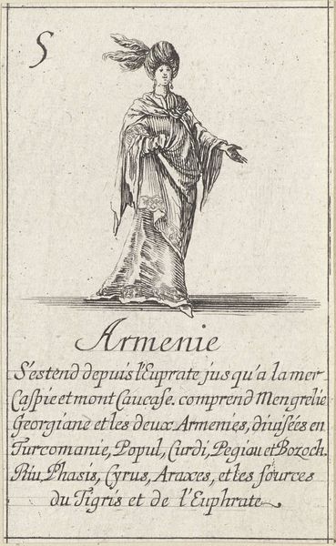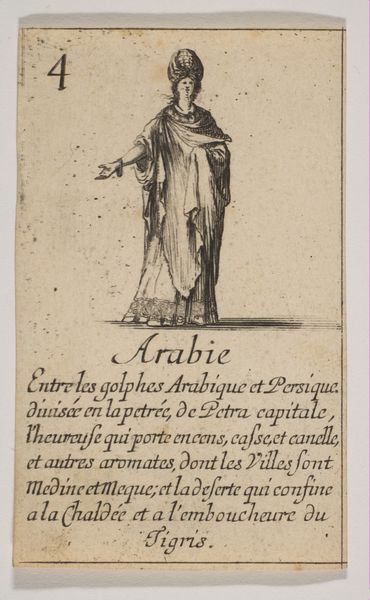 Stefano della Bella created this etching, "Vrouw uit Arabië," which translates to "Woman from Arabia," in the 17th century. During this period, European artists frequently depicted people from other cultures based on limited knowledge and often romanticized or stereotyped views. This image reflects a European fascination with the "Orient," portraying the woman in what were considered exotic garments. The text below the image describes Arabia, highlighting its trade in incense, cassia, and cinnamon, framing it as a land of valuable resources. It’s important to consider how this representation might perpetuate stereotypes or misrepresent the diversity of Arab cultures. The woman's stylized dress and pose reduce her to a symbol of a distant, 'other' land. As viewers, we should reflect on the historical context that shaped such images and the impact these representations have on our understanding of different cultures. How does seeing this image make you feel about the woman depicted, or about the relationship between Europe and Arabia at that time?