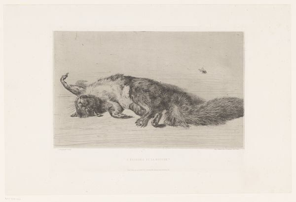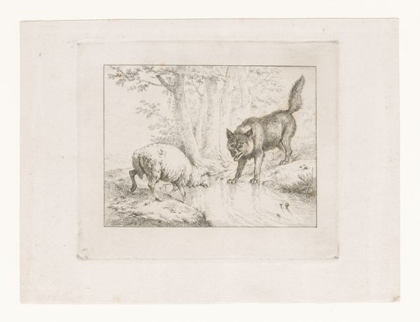 Editor: So, here we have Charles Verlat’s "Fox Hunting a Rabbit", an etching and engraving made sometime between 1834 and 1890. I'm immediately drawn to the contrasting textures, particularly how the softness of the fox’s fur is juxtaposed with the roughness of the tree bark. How do you interpret this work from a formalist perspective? Curator: From a formalist standpoint, the interplay of light and shadow commands attention, doesn't it? Note how the artist uses chiaroscuro to create depth and a sense of drama. The composition itself—a diagonal arrangement from the upper left to the lower right—guides the viewer's eye. How does that visual arrangement strike you? Editor: It does create a dynamic feel, almost as if we’re catching the scene mid-action. What do you make of the lines themselves? Curator: Precisely. The linework is remarkably intricate. Observe the density and variation, crafting both form and texture. Thick, decisive lines define the fox’s outline, while finer, more delicate strokes suggest the rabbit's fragility and the surrounding foliage. Isn't the strategic placement of dark and light areas compelling? Editor: Absolutely. The darker areas seem to concentrate the tension around the fox and rabbit, emphasizing the predator-prey relationship. So, by focusing solely on these elements – line, light, and composition – we gain insight into the emotional impact of the piece, without necessarily needing historical or cultural context. Curator: Indeed. Formal analysis unveils the inherent qualities of the work. By meticulously studying the elements, we decode the artist's choices, grasping their intention, and, more importantly, appreciating the inherent aesthetics. Has this formal examination enhanced your view of the artwork? Editor: It certainly has. I now see how the formal elements work together to create meaning, regardless of historical context. Thanks for elucidating that.