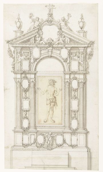 Curator: The print before us is titled "Classical Niche with Figure of a Woman." Though the artist is currently unknown, it’s believed to be created sometime in the 18th century. It uses ink and etching to present us with this figure in architectural surrounding. Editor: There’s a restrained grandeur about it, even in this monochrome depiction. The niche feels like a stage, the woman a character in a long-forgotten drama. Curator: That's astute. The architectural setting gives us important context. The Baroque loved this interplay between sculpture and architecture. Niches like this, often seen in gardens or interiors, were designed to elevate both the figure and the space around them. It merges public space with high art. Editor: Right, I’m drawn to what the woman carries. A spear signifies power or authority perhaps, and in her other hand, does she hold an oil lamp? It looks like she's a classical virtue personified. Curator: Absolutely! And her slightly idealized features and drapery, the studied pose... These recall the influence of classical sculpture during the Academic Art era. There's a visual argument here—linking present virtues with idealized pasts. Editor: This kind of clear symbolism offered a vocabulary to viewers then. The lamp as enlightenment, or perhaps eternal vigilance, within a structure celebrating order... Do we know how such images circulated? Curator: Prints were the perfect medium for dissemination, reaching wider audiences than unique sculptures ever could. These prints reinforced prevailing social norms by embodying virtues central to social and political stability in public spaces. They helped normalize ideal social models in the 18th century. Editor: It gives one a lot to think about, considering this little etching reflects so many larger movements: from art to philosophy to social messaging. Curator: Precisely. A seemingly simple image opens into layers of cultural encoding, public ideals, and dissemination strategy. Editor: An efficient demonstration of visual culture at work!