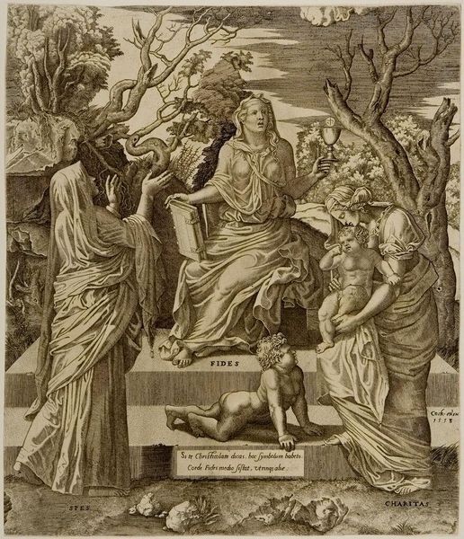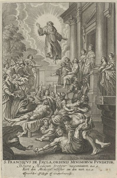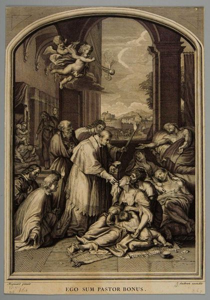 Editor: This is Johann Sadeler's "Christ Blessing Little Children." The composition feels very dynamic, almost theatrical, with all the figures arranged around Christ. What stands out to you in terms of its formal qualities? Curator: The engraving technique allows for a striking contrast between light and shadow, creating depth and drama. Note how the artist uses linear perspective, guiding the viewer’s eye toward the background architecture. Editor: So, it’s about the lines and the shapes and how they guide us through the scene? Curator: Precisely. The formal elements create a visual language to interpret the symbolic narrative within the composition. Editor: That emphasis on visual language really changes how I see the piece now.