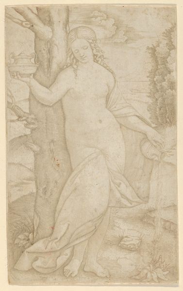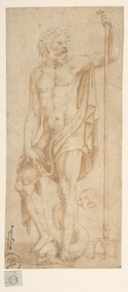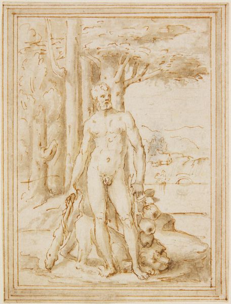 This drawing of a bracket with two figures caught in strapwork was made with pen and brown ink, with brown wash, over black chalk on paper by an anonymous artist. Notice the artist's choice of media, chalk and ink wash, which allows for a striking contrast between light and shadow. The figures, rendered with careful attention to musculature, appear to be straining against the architectural elements that bind them. The drawing's monochrome palette accentuates the drama of the scene, underscoring the tension between the figures' dynamic poses and the static nature of the bracket. The choice of such ordinary, modest materials emphasizes the skill of the artist, whose careful planning has resulted in this dramatic and complex drawing. It reminds us that even the most commonplace materials can become a vehicle for extraordinary expression.