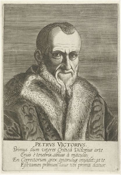 This is a portrait of Justus Lipsius, made by Philips Galle around 1606. The composition presents Lipsius in a formal pose, encased within sharply defined lines that delineate his fur-collared coat, pleated ruff, and the details of his face. The texture, achieved through detailed engraving, creates a contrast between the plush fur and the smoothness of his skin. The tight, controlled linework speaks to the prevailing artistic and philosophical interest in order and clarity during the late Renaissance. Lipsius, a philosopher who advocated for Stoicism, is depicted with meticulous precision. The engraving uses a semiotic system of lines and textures to convey his character and status. The formal qualities of the portrait – its structured composition and attention to detail – mirror the Stoic values of self-control, reason, and discipline that Lipsius championed. Consider how the artist uses line and form not just to represent Lipsius, but to suggest the intellectual and moral framework in which he operated. The artwork serves not just as an image of a man, but as a statement about philosophical ideals.