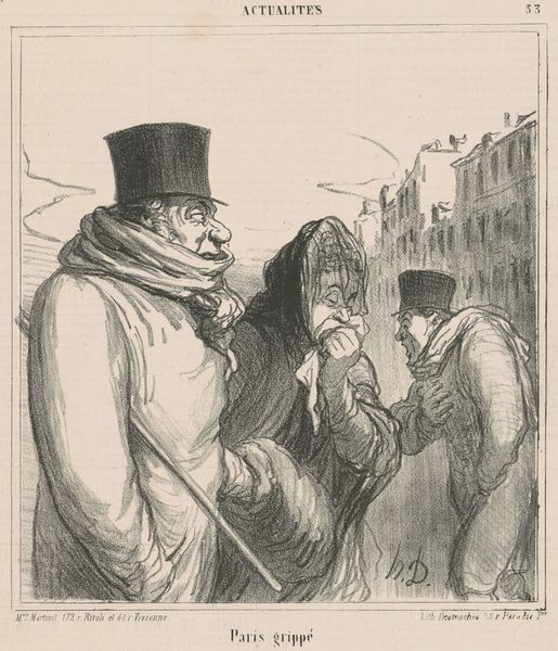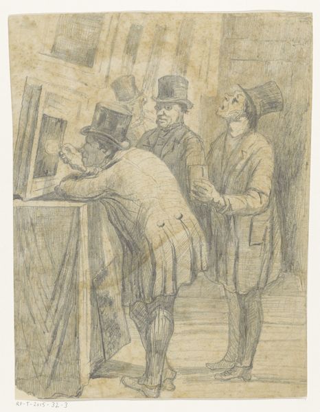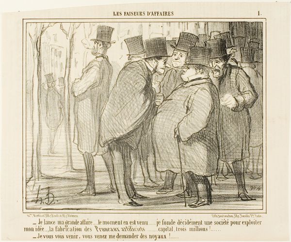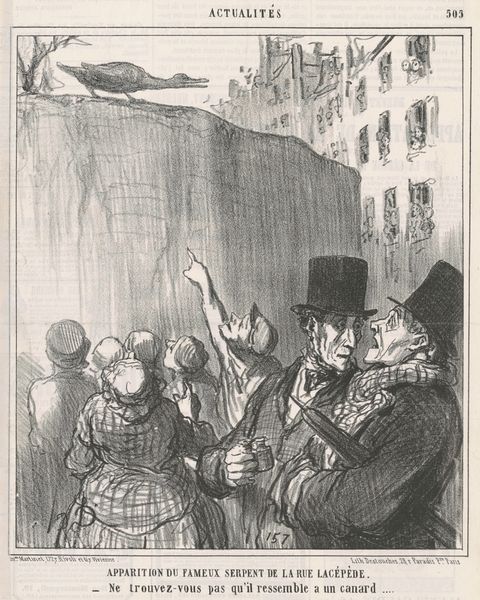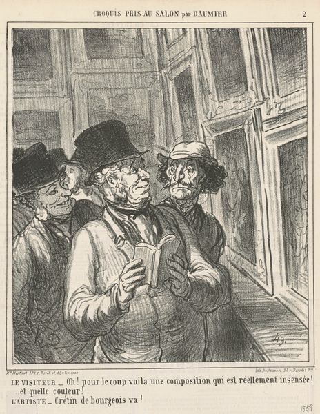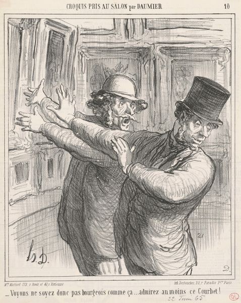 This lithograph, "Eh! Bien en regardant ce tableau," was made by Honoré Daumier at an unknown date. Lithography, as a process, is intrinsically linked to mass production. It allowed for the relatively quick and inexpensive reproduction of images, making art more accessible to a wider audience, and influencing the proliferation of printed materials. Daumier's use of lithography directly impacts the artwork's appearance, seen in the stark contrasts and detailed lines. The medium's capacity for capturing subtleties of light and shadow is evident in the shading and rendering of textures. With lithography, Daumier engaged with a technique that, while rooted in artistic skill, was also tied to the burgeoning print industry. The processes and methods of lithography, in themselves, became tools for social commentary. By considering the material and context, we appreciate Daumier's commentary on art appreciation and the societal dynamics within the art world. This challenges our perception of what constitutes art and its role in reflecting social issues.