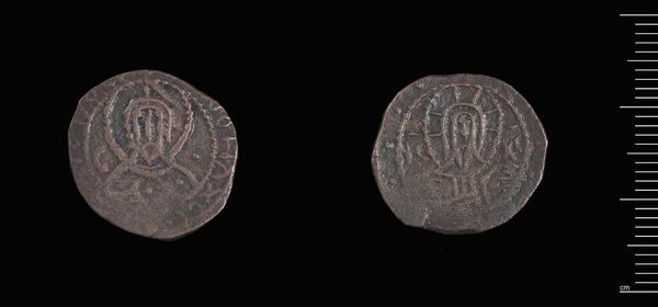 Curator: Here we have a Half-Stavraton, a coin, created by Manuel II. It's held in the Harvard Art Museums and weighs a delicate 3.42 grams. What catches your eye first about this historical fragment? Editor: Well, immediately I am struck by the intense focus on the iconography, the dense layering of symbolic elements within such a compact space. Curator: Indeed! Each image, each inscription, is a deliberate act of visual storytelling. The figure of the Virgin Mary, for instance, is not merely a portrait but a powerful symbol of protection. Editor: Absolutely, Curator. And on the other side, Manuel himself, with the symbols of his imperial authority. It speaks to the complex relationship between the earthly ruler and divine power. One cannot exist without the other. Curator: This object allows us to feel connected with our history, doesn’t it? Editor: Precisely, and I find that notion incredibly moving.