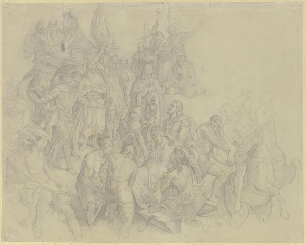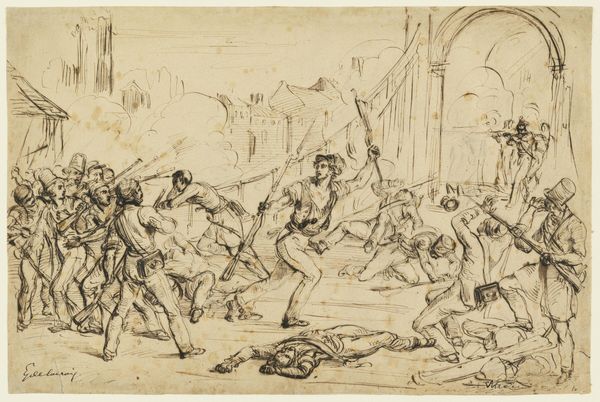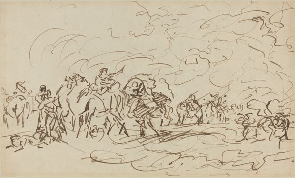 Editor: Here we have Auguste Raffet's "Study for 'The Skirmish at the Pont d'Arcole'". The frenetic energy of the ink is captivating. What stands out to you in terms of its visual structure? Curator: Notice how Raffet uses line to create a sense of movement and chaos. The composition is dynamic, almost swirling. The contrast between the dense, dark lines and the blank paper enhances the drama. Editor: I see that now. Are there specific techniques or stylistic choices that emphasize that drama? Curator: Consider the use of hatching and cross-hatching to build form and volume, particularly in the figures. Also, the rapid, gestural lines contribute to the immediacy and intensity of the scene. Observe the foreground, middle ground, and background and how the artist manipulates the space. Editor: It's a very complex image, yet it comes alive through these basic techniques. I’ll definitely pay more attention to that now. Curator: Indeed. By focusing on these formal elements, we can better understand the artist's intent and the power of the work.