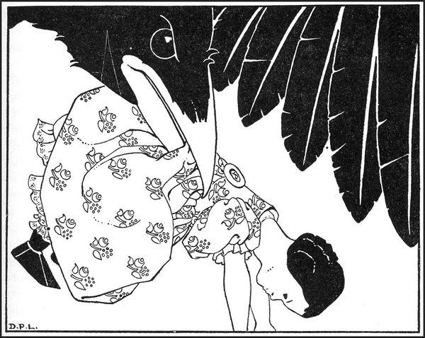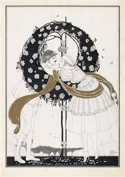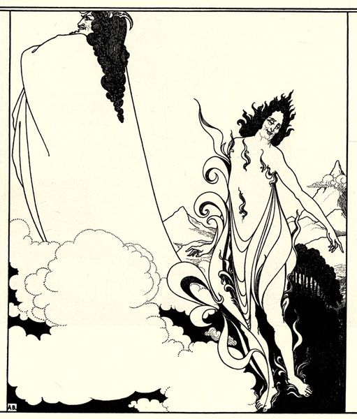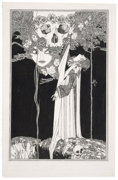 Curator: Let's spend a moment with Aubrey Beardsley's "The Peacock Skirt," created in 1893, a mesmerizing ink drawing now residing at the Fogg Museum. It practically vibrates off the paper! Editor: Yes, there’s something almost shockingly modern about the graphic impact, isn’t there? It's stark—all that black ink blooming against the white. A real testament to the power of limited materials, to the tools available to Beardsley, pens, inks, paper. Curator: Blooming! I love that description. It does feel like the ink is almost alive, doesn't it? I imagine him bent over, lost in those swirls and tendrils, chasing some decadent vision… the weight of desire pressed onto the page. Editor: Decadent is right, and so very much a product of its time! I see the repetitive labour, the countless strokes. The sheer number of individual pen strokes forming the larger images points toward mass production, this intricate piece acting as the core of what might be available on the wider market as commodities through prints, or patterns. Curator: True, true. Yet there's such precision there. It is the craftsmanship for the burgeoning market that's still a step above the rest. Consider the symbolism – the peacock, an age-old signifier of pride and vanity but twisted with Beardsley’s own brand of darkly playful perversity. See how the eye on each feather becomes almost watchful. Editor: Yes, all created with basic materials, a commentary in itself when thinking of what and who art production was typically associated with. But, if you shift focus from the subject and dive deeper into process, notice how Beardsley reinterprets mass culture aesthetics to his time. We almost feel as though we're experiencing two realities converging – both handmade production with high quality intentions. Curator: You've got me thinking now about what that blend offers. The way something so meticulously crafted, so *handmade,* becomes a commentary on the spectacle of late Victorian society. Is he complicit, critical, or somewhere delightfully in between? Editor: Well, whatever it is, "The Peacock Skirt" pulls you in for more, with the intention and capability for mass market consumption. It doesn't shy away from this material reality; instead, Beardsley puts labor and access front and center, even while the dream unfolds, in the ink, on paper. Curator: Leaving us to ponder… whether the pen is mightier than the pose, or perhaps just the most accessible way to reflect on the complexities of what it means to "see." Editor: Absolutely. Ultimately, it asks us: what materials and access will future generations utilize to make new, equally complex statements?