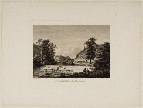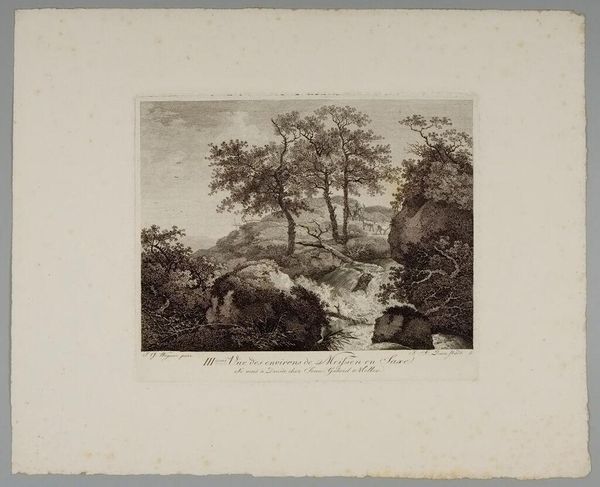Curator: This is Johann Adolph Darnstedt's "Second View of the Outskirts of Meissen." Editor: It’s evocative! The bridge teeters precariously over the churning water; it suggests the frailty of human endeavor against nature's raw power. Curator: Notice how the bridge serves as a symbolic link, connecting the known and unknown. The dark rocks contrast with the open sky, a classic romantic visual trope. Editor: I'm drawn to the process. Darnstedt, born in 1769, used printmaking, a medium accessible to a wider audience. It democratizes landscape, making views of Meissen consumable. Curator: It speaks to a longing for simpler times, for connection to the land itself. Editor: Perhaps it also hints at commodification. These prints became desirable objects, reflecting a growing market for picturesque views. It is a visual document tied to production and exchange. Curator: A fascinating intersection of the symbolic and the material, offering layered readings for our time. Editor: Indeed. An image that invites us to consider both the natural world and our relationship to it.