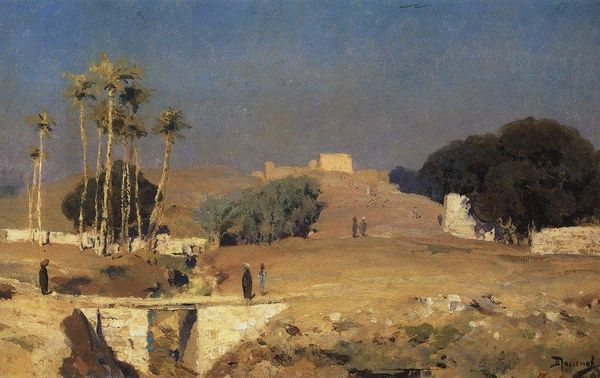 Editor: This is Vasily Polenov's "The Mosque of Omar. Haram el-Sharif," painted in 1882 using oil. The palette seems very subdued. The details in the stonework leading to the Mosque appear softened, creating almost a hazy effect. What do you see as the most compelling aspects of its visual composition? Curator: Note the composition's careful arrangement of forms and tonalities, independent of its subject. The gradations of light across the stone create subtle shifts in texture, do they not? Consider how Polenov establishes a visual rhythm, drawing your eye upward via the interplay of verticals—the slender trees—and horizontals present in the terraced stairs. Editor: Yes, I see what you mean about the visual rhythm, but I am not certain about ignoring the subject matter. Isn't the site important to this piece? Curator: The painting's true merit lies in the mastery of its pictorial structure. Reflect on the architectural space formed less by the rendering of the mosque itself but more emphatically rendered by the pattern of solids and voids, light and shadow. These pictorial components create depth and establish spatial relationships without direct dependence on context. Consider this his focus. Editor: So you are saying the "what" is not as relevant as the "how?" It is an interesting concept to apply to this piece. Thank you. Curator: Indeed. Analyzing the work using a formal lens brings an appreciation based solely on Polenov’s handling of compositional tools. It refines our visual perception itself.