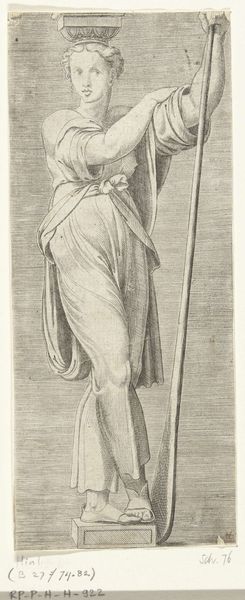 Curator: This is "Sibille op de rug gezien met het hoofd naar links geneigd," an engraving by Lambertus Suavius, likely created between 1520 and 1567. The work demonstrates intaglio techniques and embraces a Mannerist aesthetic. Editor: Right. First impression? Melancholy. She seems burdened, doesn’t she? Her head is bowed, as if contemplating something tragic. Even the light seems to avoid her face, clinging instead to the fabric of her gown. Curator: Indeed. The draping is quite significant. The way the gown is tied, almost cinched, at her back draws focus to the contrapposto, a counter-positioning that allows for the depiction of movement within a static form. Editor: You see movement, I see constraint. She’s framed within this rigid archway, as though she's trapped in some gilded cage of fate. Is that too melodramatic? Curator: Not necessarily. Sibyls, in classical antiquity, were figures of prophecy, often burdened with knowledge of the future. The downward inclination of her head may signify deep introspection or even sorrow at what she foresees. The nudity suggests vulnerability, which is a potent addition to the composition. Editor: Exactly. There's this contrast of vulnerability with the classic architectural lines. It’s both exposed and sheltered at the same time, which creates this beautiful tension. You almost feel intrusive just looking at her. Curator: The artist utilizes a fine, dense network of lines to build volume and texture, paying close attention to how light models the form. This contributes significantly to the sculpture-like quality of the figure. It's Mannerist idealisation. Editor: I agree. She's been turned into a statuesque idea, someone beautiful even when her back is to us, but she is also human, pained, which elevates the composition in my opinion. She really makes me stop to think. Curator: An ideal point to conclude our examination of this powerful piece. It offers a fascinating glimpse into Mannerist interpretations of classical themes. Editor: And a good lesson about looking closely, about observing not just what’s presented, but what it evokes within you. It also makes you look up the original stories behind the Sybils, very worthwhile.
