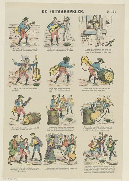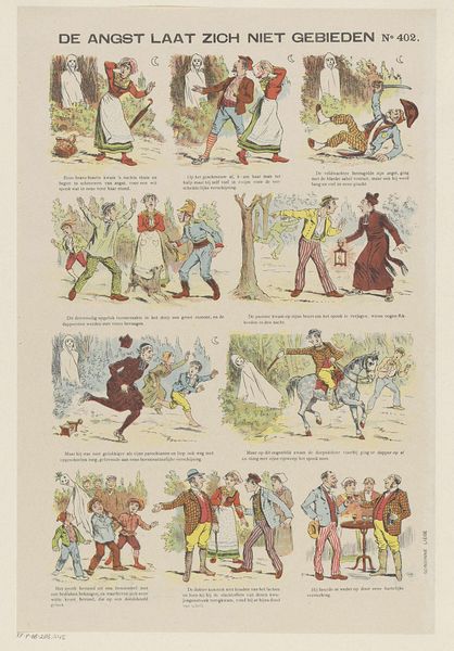 Curator: This lithograph, rendered between 1894 and 1959 and currently held here at the Rijksmuseum, is entitled "Het rijwiel 'de ononerwinnelijke'". The artist behind this piece is Gordinne. It feels like something out of a children's book; naive, light-hearted. Editor: My initial impression is one of gentle chaos, perhaps, an anticipation of comedic calamity. The figures are positioned in tiers like frames of a flip-book, each row showcasing another phase of the story. What do you know of its place within the history of cycling imagery, for example? Curator: At its core, the artwork showcases a cycling race. The bicycle is presented not just as a vehicle, but as an icon of modernity and progress, ideals embraced by the late 19th century, when cycling boomed in popularity. It depicts a visual narrative, really, about ambition, progress, but also, as you pointed out, gentle chaos. It is also a depiction of class. Editor: Yes, you can feel those aspirations intertwined with anxieties about social mobility and access. There are many of us who never were welcome in such activities, even today. And is it my imagination, or are some of these competitors destined to fail, a premonition of downfall through overreaching? This comic-strip format itself almost seems to invite class analysis through accessibility and the flattening of hierarchy within its form. Curator: It is entirely possible! And don't forget, the turn of the century was also a time of social commentary through caricature, especially within printed media. A work like this could very well act as a playful jab at the seriousness of competition or the absurdity of fixating on victory at any cost. Its creator was no doubt involved with progressive issues in Belgium. Editor: Thank you. Seeing it through that lens clarifies so much; the artwork is now charged with potential criticisms of early consumer culture wrapped up in what initially reads as simplistic humor. The very material it’s printed on seems to amplify its accessibility, refusing the high-art trappings some viewers expect. Curator: Indeed. We began by acknowledging the simple composition and naive style. Perhaps these very traits were intentional choices geared to resonate more strongly and universally during this time. Editor: So it seems even humor may carry significant ideological baggage, inviting us to unpack not just what we see but why, especially when looking at so called innocent work, to reconsider it for its social fingerprint.