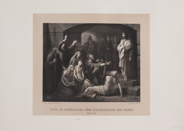 Dirk Jurriaan Sluyter created this print depicting ‘Christus met de Syro-Fenicische vrouw’, which translates to 'Christ with the Syrophoenician Woman'. The greyscale image is rendered with intricate cross-hatching, setting a somber tone. A woman kneels, beseeching Christ, who stands centrally, flanked by onlookers. Sluyter employs compositional techniques rooted in classical traditions. The subjects are meticulously arranged, evoking both drama and a sense of staged solemnity. Light and shadow are handled to create depth and emphasize the emotional intensity of the scene, highlighting the contrast between the supplicant and the impassive figures surrounding her. This print reflects an interest in the intersection of religious narrative and social hierarchy, a common theme in 19th-century art. The woman's posture and the detailed rendering of Christ’s face invite us to consider how these symbolic and visual cues reinforce or challenge societal norms, and ultimately invite ongoing interpretation.
