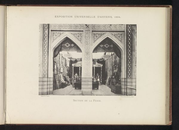 Curator: This photograph, taken in 1894 by Th. Lantin, showcases the exterior of the Algerian pavilion at the World Exhibition in Antwerp. Editor: My immediate reaction is how…constructed it feels. Almost like a theatrical stage set, with the very geometric architecture against that big, flat space. Curator: Well, world exhibitions were about displaying an idealized version of cultures and progress. Notice the prominence of Islamic architectural motifs; the tall minaret-like tower, the intricate dome of the pavilion…these project a romantic, yet simplified, view of Algeria. Editor: Simplified indeed, perhaps even exoticized for European consumption. Algeria at this time was, of course, under French colonial rule. This pavilion becomes an interesting representation, doesn’t it? An "Algeria" constructed within a colonial framework, for the colonial gaze. Curator: Absolutely. The placement of these traditional Islamic visual symbols amidst a space designed for a globalized audience tells a compelling story about the cultural exchange and also the power dynamics that characterized the era. It highlights a fascination with “the Orient” prevalent during the period, almost creating a fantasy space. Editor: And it’s a very sanitized fantasy, isn't it? No chaos, no struggle, just clean lines and picturesque details. The absence of Algerian voices and perspectives in the pavilion’s creation speaks volumes about the colonial project. Curator: You're right. The symbols displayed, while visually striking, omit the full spectrum of Algerian history and lived experience. Instead, it seems curated for European ideals. Even the two figures in Western dress amplify this notion of cultural performance and interaction. Editor: Precisely. The photograph acts as a potent reminder that what we often perceive as cultural exchange can be deeply intertwined with histories of oppression and power imbalance. Curator: Understanding these visual complexities in historical images helps us interpret them, while also contextualizing the relationship between aesthetics, symbolism, and ideology within intercultural interactions. Editor: I agree. By unveiling the complex socio-political forces that shape art like this photograph, we foster critical engagement and a more nuanced understanding of our world’s interconnected, sometimes conflicted, past.