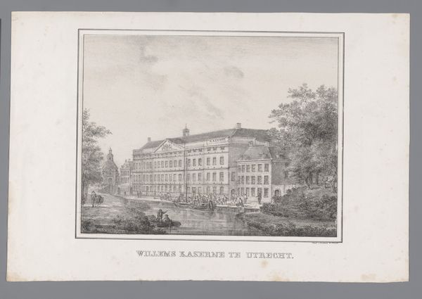 This print, depicting the Coolsingel Hospital in Rotterdam, was made by Cornelis Gerrit Verburgh in the 19th century. It's an etching, a printmaking technique where lines are incised into a metal plate using acid. The crisp precision achieved with this method allowed Verburgh to capture the architectural details of the building and the surrounding scene. The image is framed by an ornamental border, a design style characteristic of the period. Notice the weight and texture of the paper itself, which has aged, adding a layer of history to the print. The production of prints like these involved skilled labor, from the artist's design to the etching process and the printing itself, and was tied to the growth of the printing industry and its technologies. This work offers a glimpse into the social context of the time and the labor involved in creating such images. Appreciating the materials, the making, and the context allows us to see beyond the subject matter and understand the broader cultural significance of this print.