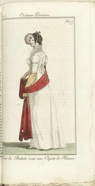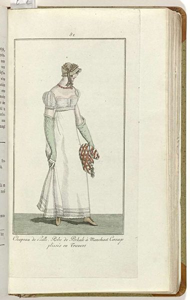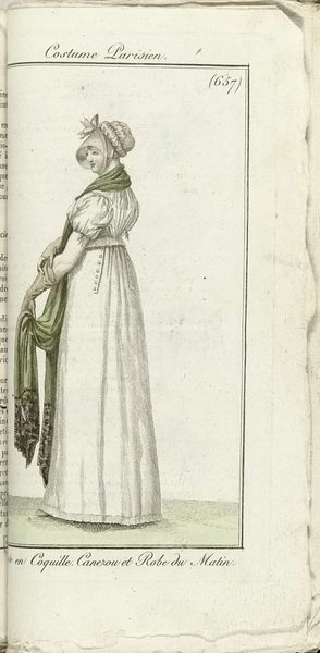 Editor: Here we have Horace Vernet's "Journal des Dames et des Modes, Costume Parisien, 1805, An 13 (634) Touffes de Violettes. Robe Ronde.," created in 1805. It’s a drawing, a print actually, showcasing a neoclassical dress. It strikes me as quite delicate and refined, capturing the fashion of the era with remarkable detail. What symbols do you notice within this piece? Curator: What I see are echoes of ancient Greece, particularly in the high-waisted dress, almost like a chiton. The flowing fabric, the relative lack of heavy ornamentation… these recall a desire for simplicity and a return to classical ideals after the more elaborate styles of the previous century. Even the color palette – largely white, with delicate greens and violet accents – suggests purity and a connection to nature, both important themes in the neoclassical movement. Editor: I didn't think about the colors in that way, influencing symbolism. Does the title itself, "Touffes de Violettes," – bunches of violets – carry any significance? Curator: Absolutely. Violets are traditionally associated with modesty, humility, but also with secret love and remembrance. Their inclusion here is telling, not just as a decorative element, but as a subtle symbol of the wearer’s character and inner life. Notice how the violet "touffes" adorn her headpiece, framing her face, suggesting perhaps, these are the attributes with which she wants to be seen. Do you think the woman would necessarily adorn violets? Editor: That's such a specific association! I would have thought it was just about fashion, but you're right, it speaks to more than that. So it shows her virtues? Curator: Perhaps that is aspirational, an attempt to assert these ideals through fashion, mirroring values society cherishes. We learn to look beyond the surface, discerning coded symbols revealing insights of an era. Editor: It's incredible how much is embedded within this seemingly simple fashion plate. I'll definitely view fashion illustration differently going forward.