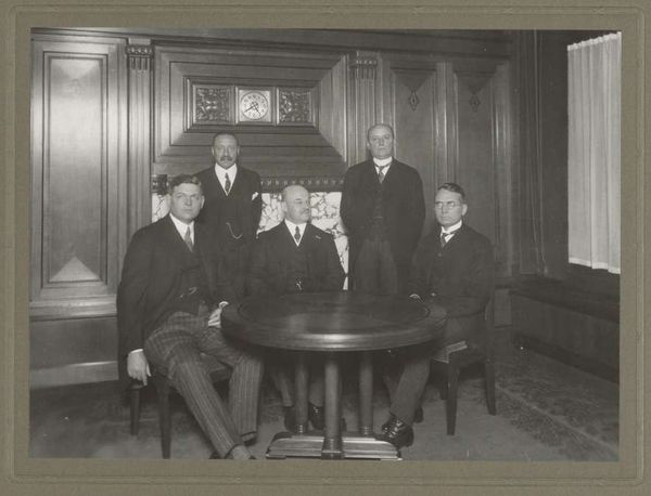 Curator: This intriguing historical photograph, simply titled "College van Burgemeester en Wethouders van Rotterdam," captures a formal gathering. It's estimated to date from between 1880 and 1920, and the photographer is J.H. Wolf. Editor: My first thought? Authority. Look at the formality, the gravitas. There's a weightiness conveyed not only by the serious expressions, but also by the sheer mass of dark wood and fabric in the room. Curator: Precisely. Let's consider the materiality of this image. Photography in this era was a laborious process. The large-format cameras, the glass plate negatives... Each print required skill and time. The sepia tones, the texture of the paper itself—these were not throwaway images, but carefully considered objects produced for a specific purpose. They were material manifestations of power. Editor: And look at the composition—the deliberate arrangement of figures around that massive table. The table itself is laden with papers and what appear to be official documents. The circular shape is no accident; it suggests unity and shared decision-making. Then observe the imposing mirror on the back wall which appears to double the perception of items on the table creating more emphasis on decision and authority. The image becomes almost archetypal, doesn’t it? Curator: The sartorial details are telling. These men are impeccably dressed in dark suits, the uniform of civic duty. Each detail, from their meticulously groomed facial hair to their starched collars, speak to the values of the age: order, decorum, and the visible display of social standing. The consumption involved in the production of those clothes marks their societal status in the Rotterdam society. Editor: Those suits act almost like shields, uniforming them, yes, but also hiding the individuals beneath. The severe backdrop also conveys stability but lacks any personal details that humanize them. Curator: It does feel as though the symbolism intentionally outweighs personality. This photograph is an artifact of a particular historical moment, offering a glimpse into the material culture of governance. Editor: Agreed. This image, beyond simply portraying a group of men in a room, encapsulates a cultural narrative, almost a staged ritual of authority and collaboration from a bygone era. A powerful statement in visual terms. Curator: Indeed. By understanding the materiality and manufacture of the photographic print, we can perceive it as something far greater than merely a photograph: it stands as a testament to social and power structures of late 19th Century Europe. Editor: It has certainly shifted my understanding of the image and these men captured.