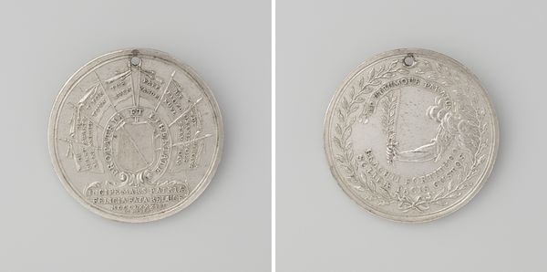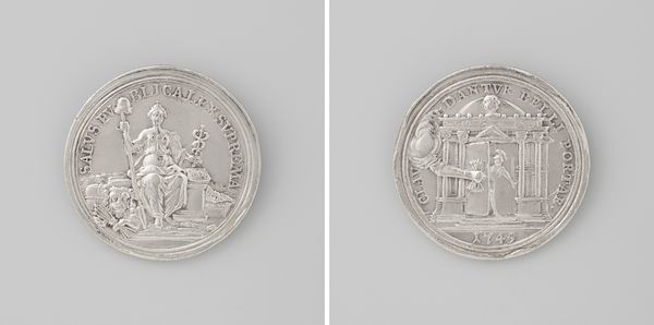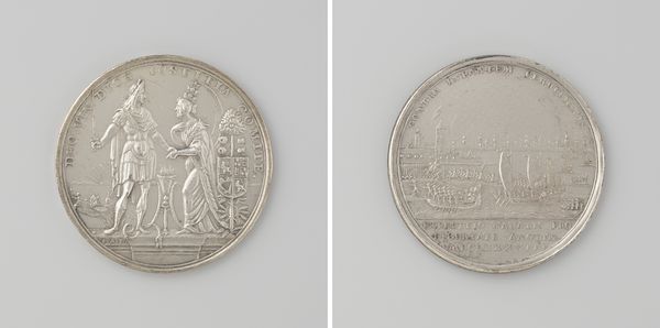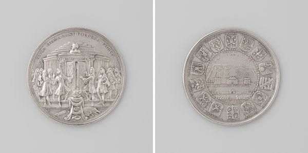 This small silver medal, crafted by Johann Thomas Stettner, presents two distinct yet interconnected visual fields. The first features a classically draped figure set against radiating lines, while the second depicts an elaborate archway. These elements, carefully arranged, invite a deeper exploration of their symbolic resonance. The medal's design orchestrates a dialogue between victory and its representation. On one side, the allegorical figure seems to bless the earth. This can be interpreted using semiotics as a sign of peace and prosperity following conflict. The opposing image of the archway—a triumphal structure—functions as a cultural symbol of military achievement and imperial power. Note the inscription "Gloria" above the arch, reinforcing themes of fame and recognition. This medal is not merely a commemorative object; it's a condensed narrative about power, victory, and their enduring representation in art and culture. As such, it prompts a reconsideration of how societies construct and celebrate their triumphs, a process that continues to evolve.