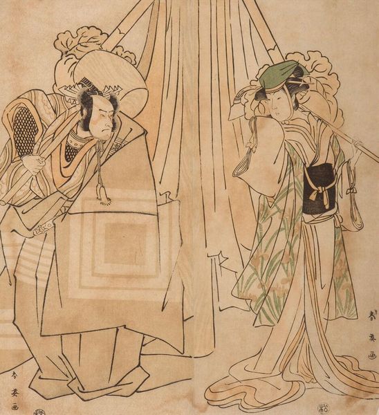 Curator: This is Katsukawa Shun'ei's "Act Nine from the series Treasury of Loyal Retainers." It captures a pivotal scene from the Chushingura story. Editor: There's a stark contrast between the interior warmth and the snowy scene glimpsed through the doorway; it feels like a visual representation of duty versus desire. Curator: Precisely, the symbolism is layered. The snowy landscape represents the harsh circumstances, while the figures are carefully positioned to convey complex emotions. Editor: I'm drawn to the materials, though. The woodblock printing technique allows for such intricate detail in the kimono patterns, reflecting the craftsmanship of the era. Curator: Indeed. The clothing tells its own story, signifying rank and allegiance, but also vulnerability. Editor: It's compelling how Shun'ei uses a common material process to convey such a specific socio-political narrative. Curator: I agree; these choices contribute to the drama and the artwork's lasting power. Editor: A perfect example of art informing us about past traditions.