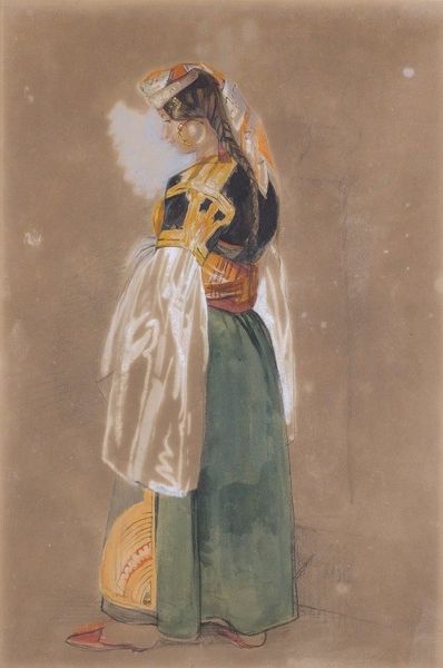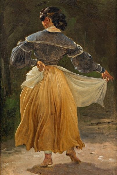 Wilhelm Marstrand captured this study of a dancing Italian woman with oil on canvas. The painting's composition draws us in with its soft, warm palette of pinks, yellows, and creams, creating a sense of gentle movement. Marstrand's technique focuses on capturing the play of light and shadow. Notice how the brushstrokes define the folds of her skirt and blouse, emphasizing the textures and volumes. Her backward glance adds dynamism, suggesting a story beyond the frame. The figure's clothing and posture become signs of a culture and identity. This resonates with broader themes of Romanticism and its interest in the 'exotic' other. Marstrand’s formal approach allows the dancer’s pose to stand out from the pale backdrop, capturing a transient moment. The composition of the painting doesn't present a definitive narrative. It leaves us to ponder questions about identity, representation and the fleeting beauty of dance.