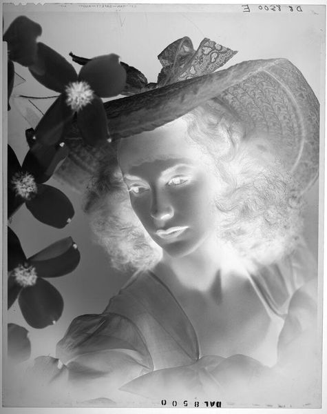 Curator: This photograph, currently untitled, comes to us from Lucian and Mary Brown, and features a young woman, outdoors. It’s a gelatin silver print. Editor: The texture is incredible, almost ghostly. I can see the material of her clothing so clearly in the stark contrast. Curator: Yes, and consider the printing process. Each step, from exposure to development, influenced the final image and how it circulates. Editor: It's fascinating how the everyday scene, the ordinary act of portraiture, is elevated by the manipulation of light and shadow. Curator: Exactly, portraiture was a powerful tool, used to reinforce class structures. Editor: Though its inverted tones, the print feels more ethereal than formal. Curator: I agree, it asks us to look beyond the surface. Editor: It makes me think about the labor involved in printing and the social context of accessing photographic materials at the time. Curator: It's a testament to the way artists can redefine the narrative simply through their chosen medium. Editor: The starkness really leaves an unforgettable imprint.