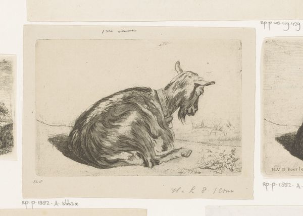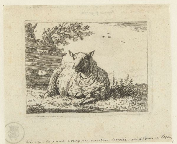 Curator: Before us is "Liggende geit bij water" or "Reclining Goat by the Water," an etching created by Hendrik Willem Schweickhardt in 1788. It's held here at the Rijksmuseum. Editor: Right away, there's something almost melancholic about it. The goat seems lost in thought, its gaze averted, maybe pondering the mysteries of the waterway in the distance. It looks like a humid afternoon. Curator: The landscape, although sparse, plays a vital role. Note the texture achieved through meticulous lines; observe the light as it defines the animal's form. Schweickhardt really shows an amazing facility with the etching technique. Editor: And the collar around the goat's neck tells a story too, doesn't it? Is it tethered or simply collared? Are there any other buildings around? The solitary depiction isolates the poor animal... I immediately feel empathy, like I can understand its ruminations. Curator: It allows for a discourse around 18th-century pastoral aesthetics. Look closely, the composition positions the goat in direct correlation to natural elements such as the tree and felled timber. They form almost one visual and representational matrix. Editor: The balance between detail and open space is just right. The etching is sparse, it doesn't attempt to say too much and in so doing speaks volumes about our emotional bond to landscape and its living things. I just keep coming back to this sense of pensive stillness it conveys. It really draws the eye. Curator: It also speaks volumes about the artist's relationship to the landscape tradition; a deep, academic engagement with both history and practice, visible in every line, I’d argue. Editor: I'd agree with that! Now looking back, I think what stays with me is just the sense of shared quiet; us and this animal staring, pondering the scene together as one. I love how it manages to capture a brief, passing emotional truth so effectively, so humbly. Curator: A powerful image achieved through technique and careful composition, that also manages to make us pause and reflect—what more could one ask from a simple animal portrait from the late 18th Century?