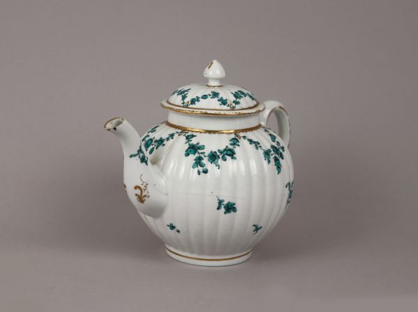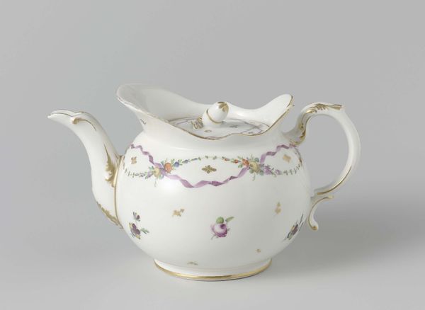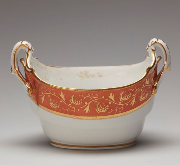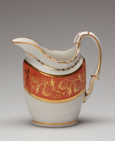 Curator: Standing before us is a “Creamer,” crafted around 1820 by the Wedgwood Manufactory. A seemingly simple vessel made of ceramic, now held at The Art Institute of Chicago. Editor: Immediately, the delicacy of it strikes me. That crisp white against the shimmer of gold makes me feel like I’ve stumbled upon a secret from a Jane Austen novel. Curator: It absolutely has that period charm! What’s interesting here is the marriage of function and aspiration. These refined ceramics weren’t merely functional, but emblems of status, reflections of wealth in a society undergoing seismic industrial changes. Editor: You see, that’s where the material reality gets compelling. The precision required in production, the controlled firing in the kiln, and the global supply lines for the raw materials—clay from specific quarries, gold from distant mines. There is labor in every element! And that faux-bois detailing of the handle suggests an embrace of industrial mimcry. Curator: Ah, that little flourish of "nature"! I love that contrast. Even the embossed leaf patterns across the body feels delicate—almost as if a garden’s secrets are captured. A subtle kind of trompe l’oeil? Editor: Very subtly—but it makes me consider, for whom was it meant? Wealthy patrons seeking refinement, aspiring merchants eager to showcase status… These objects become charged with social meaning when handled and used. That gilded rim… that's the part touching skin. Curator: A tactile luxury! It's incredible how a seemingly humble item becomes a reflection of cultural currents. It truly demonstrates how, by understanding their role and cultural relevance, we understand ourselves. Editor: And considering these are mass produced, to a certain extent… It prompts a re-evaluation of the very essence of artistic merit—is it truly possible to divorce the aesthetic from labor itself? Curator: It's a question without an easy answer, really, which is one of the things that makes engaging with artworks like these rewarding. We carry on those very dialogues. Editor: A beautiful and humbling little "Creamer," really, isn't it? Both a functional tool and a powerful window into history, consumption, and social relations.
