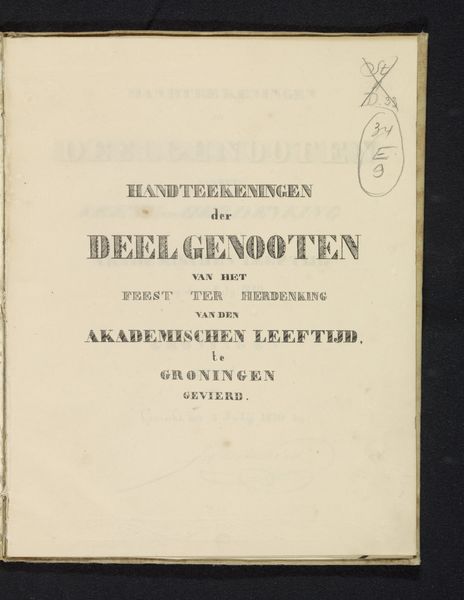 Curator: This print, created in 1836 by Leonard Eduard Bosch, commemorates the second centennial celebration of Utrecht University. Editor: At first glance, the typography is captivating. There is something very sober and elegant in how all of the titles are arranged on the page. What do you think? Curator: Indeed, observe how Bosch employs varying typefaces and sizes to establish a visual hierarchy. The weight of 'Naamlijst' immediately draws the eye, a classic strategy for emphasizing importance through form. Editor: A "Naamlijst" that sounds Dutch. From my understanding of symbolic Dutch traditions and looking at the words, ‘Optogt des Nederlandschen Legers naar Ostende’, I wonder if there's a hidden symbolism there linked to Dutch military identity of the time. What's the deal with the parade being about the Dutch army? Curator: You're correct; "Naamlijst" translates to "List of Names". This was commissioned by the student committee, documenting the historical procession planned for the 200-year celebration, which would depict... Editor: A symbolic staging. The "procession of the Dutch army towards Ostend." That tells us volumes, doesn't it? Ostend brings the collective memories to a siege during the Dutch Revolt. This wasn't just a list, but an effort to connect those students with the visual legacy of a specific narrative. Curator: It is an explicit visualization, linking these students to that foundational military narrative. If we analyze it formally, we note the strong horizontal and vertical axes. It mirrors the discipline they hope these students inherit. Editor: It’s more than mirroring; it’s a powerful assertion, weaving them into the very fabric of Dutch history! It prompts me to consider whether there was a tension here; a university presenting itself as a pillar of established values as revolutionary ideologies were brewing across Europe. Curator: An intriguing intersection indeed. It is a visual artifact that bridges design and history, provoking discussion about how institutional legacy communicates power, identity and self-image. Editor: Exactly, the list speaks far beyond its nominal purpose; it reverberates through historical symbolism to resonate powerfully even today.