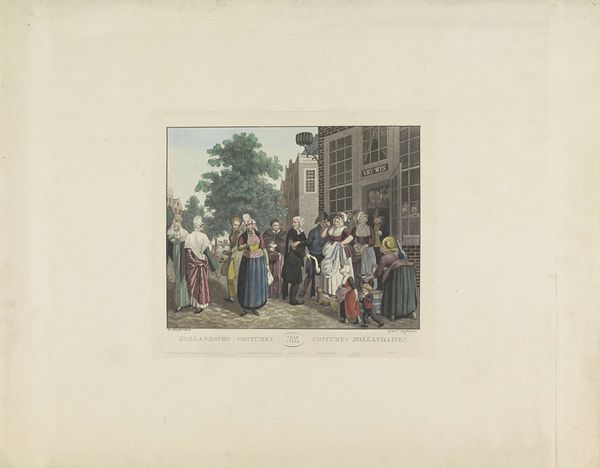 Art Historian: Formalist Editor: This is an interesting print, seemingly untitled, though it is referred to as "Dorpsplein met kinderen rond een kijkkast," placing it sometime between 1850 and 1900. I believe it’s a hand-printed image, though showing its age through the yellowing of the paper. The overall mood is quite charming; children gathered around some form of traveling show, but I am curious as to what draws your attention in this work? Art Historian: What immediately strikes me is the deliberate use of the oval format. How do you perceive this choice impacting the composition? Editor: It seems to isolate the scene, like a captured memory or a glimpse through a spyglass, containing the scene. Does this not serve to emphasize the feeling of a fleeting moment observed? Art Historian: Indeed. And what about the relationship between the figures and their setting? Observe the interplay of light and shadow, the brushstrokes, and how they define the forms. Note the textural contrast between the rough-hewn architecture and the softer, rounded shapes of the figures. Does this offer some interesting lines and form for the eye to follow? Editor: Certainly, the buildings are more rigid, whilst the artist captured the people in curved smooth forms which serve to soften the architecture behind them. Art Historian: Precisely. Consider the placement of each element within the frame. How does the artist manipulate space and form to create depth and balance? Where does your eye go first, and why? Editor: The group of children, mostly as they’re centered but also due to the various pops of colors and detailing in their attire. But also my eye gets carried around the piece, there is not a section in the composition left untouched, even in the upper reaches of the sky the tones capture me, it keeps it enclosed rather than sparse. Art Historian: It is not simply a representation of a village scene, but a carefully constructed arrangement of shapes, tones, and textures that create a unique visual experience. Note how the artist organizes the picture’s surface to reveal underlying principles of harmony and order. A dynamic interplay between the forms, isn't it? What new appreciation has formal analysis opened up for you? Editor: I had not viewed it that way, by diving into the surface qualities you come away with a completely alternative reading and it causes a closer, more intimate viewing of the work. I appreciate this take on the artwork!