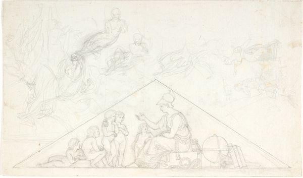Editor: This is a sketch by Henryk Siemiradzki from 1883, titled "Sketches for the 'Aurora' ceiling in the J. Neczajewa-Malcewa Palace in St. Petersburg." It's a pencil and pen drawing, and it feels very dynamic and preliminary, like the artist is working through a lot of ideas. What stands out to you when you look at this work? Curator: This sketch compels me to think about the commissioning process and the economic relationship between Siemiradzki and his patron. This wasn't simply a matter of artistic inspiration, but a commercial transaction where artistic labor was deployed to decorate a space, reinforcing the patron's status through symbolic representation. Notice the recurrent image of Aurora – her presence suggests a calculated attempt to associate the commissioner with ideas of renewal, perhaps even legitimizing newly acquired wealth and status. Editor: That's interesting. So you're saying it's less about the mythological content and more about what the artwork *does* for the person who commissioned it? Curator: Precisely. The "academic art" style wasn't simply a default artistic mode. It was a choice reflecting the aspirations and socio-political landscape within which this elite patron existed. We need to also consider the labour involved, right from the graphite mine to the artisan skilled in preparing drawing surfaces to understand the materiality informing this work. Does the paper choice suggest something about the relative ‘finish’ this sketch required, compared to other works produced by Siemiradzki at the time? Editor: I hadn't considered all those layers! I was so focused on the figures themselves. Now I see how much the material and economic aspects shaped even this preliminary sketch. Curator: Indeed, art isn't made in a vacuum, the social dynamics, the networks of patronage, and the materiality are integral to our understanding of these images. This close inspection pushes us to redefine not just art, but who and what constitutes ‘art’. Editor: It's amazing how focusing on materials and context changes the entire meaning of what I’m seeing. Thanks for pointing that out.