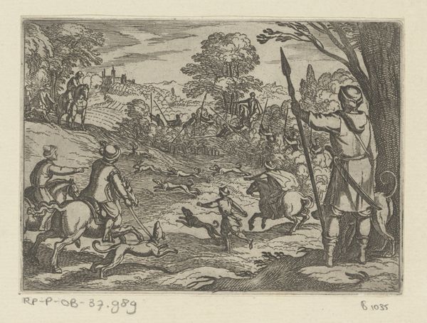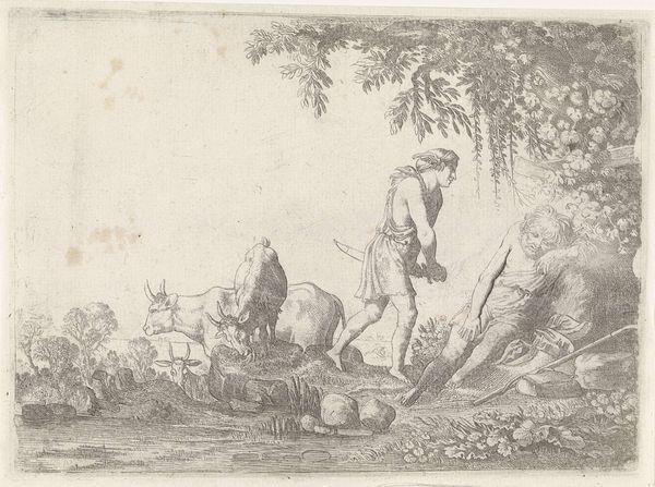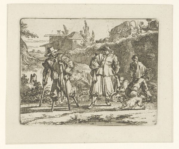 Editor: Here we have Giovanni Domenico Tiepolo’s "Mary, Helped by Two Angels, Follows Joseph with the Donkey, plate 25 from The Flight into Egypt", made in 1753. It's an etching on paper. The busy composition and the figures set against the vast landscape create an atmosphere of urgency and vulnerability. What strikes you most about this piece? Curator: What resonates with me is how Tiepolo uses this biblical scene, "The Flight into Egypt," to explore themes of displacement and refuge, echoing the social upheavals of his time, and even ours. The precariousness of Mary and Joseph's journey speaks to the broader human experience of seeking safety. Considering the historical context of 18th century Europe, with its own political and religious tensions, do you see any parallels? Editor: I hadn't thought of it that way. I was focused on the religious aspect, but the broader theme of seeking refuge makes it much more relevant. So, it’s not just a historical depiction, but a commentary on the human condition? Curator: Exactly. Think about the power dynamics at play: a family forced to flee, relying on faith and the help of angels. It raises questions about who is considered worthy of protection and how societies respond to those seeking asylum. What do you make of the choice of landscape as a backdrop to their plight? Editor: The vastness of the landscape emphasizes their smallness and vulnerability, but also perhaps the hope of finding safety in a new land. The choice to depict it as a print, something reproducible and accessible, is interesting, too. Curator: Precisely. It democratizes the image, making this narrative of displacement and hope available to a wider audience. Understanding these layers allows us to engage with the artwork beyond its religious subject matter. Editor: This really makes me see the work in a completely new light. It’s much more complex than I initially perceived. Curator: That's the beauty of engaging with art through a critical lens. It transforms a historical depiction into a relevant commentary on our shared humanity.