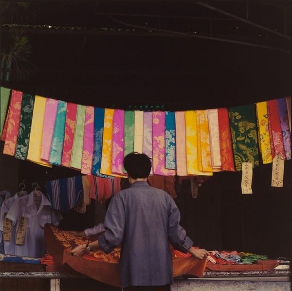 Editor: This is Helen Levitt's "New York" from 1971, a color photograph. The two children near the candy machines create such a melancholic atmosphere, while the color scheme gives a very old-school vibe. What's your read on it? Curator: I find in Levitt’s work a constant, almost anthropological inquiry into the rituals of childhood played out against the backdrop of urban life. What symbols do you see repeated in her works? Editor: I've noticed she captures fleeting moments with an emphasis on gesture, like how the girl holds the cup with a straw. How might that emphasize emotional depth? Curator: Consider the repeated motif of the street corner as a stage. Levitt isn’t simply documenting; she's curating a specific cultural memory of New York. Notice how the cool blue tones of the building contrast with the warm hues of the children's skin and the gumball machines. Editor: Absolutely, there's a sense of staged theatre. It's quite clever how she uses colors to highlight the distance between those children and their surroundings. Is she saying something about New York here? Curator: Precisely! Perhaps that constant negotiation between individual experience and the collective identity of city life? The children become allegories for innocence navigating an increasingly complex world. This contrast is a cultural obsession, isn’t it? Editor: I see what you mean! It's less a straightforward snapshot and more a layered portrait of a place and time. What remains with you when seeing a picture like this one? Curator: A deep sense of human resilience and continuity. Levitt captured how play persists even within the harsh realities of urban life. It reminds us of our shared narratives and experiences. Editor: Thank you! I now have a much greater appreciation for the artist's subtle ways to comment on urban life.