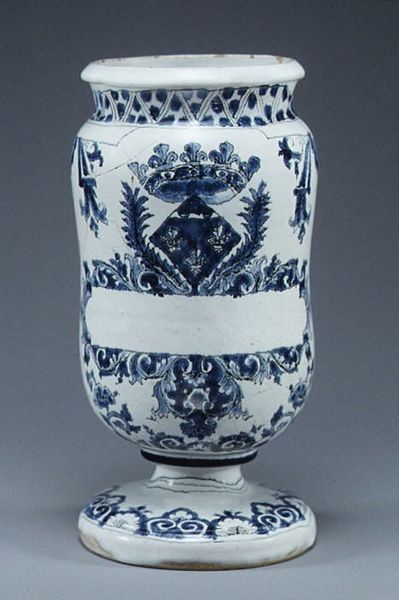 Curator: Here we have a "Vase" crafted between 1723 and 1725 by the Meissen Porcelain Manufactory, currently residing at the Art Institute of Chicago. It's a captivating piece of decorative art, showcasing the early heights of European porcelain production. Editor: My first thought is of delicate storytelling. The blue on white is immediately calming, but the scenes create such an intricate world on its surface. It’s more than a vase; it feels like a portable landscape. Curator: Absolutely. Meissen was, after all, the first to successfully produce hard-paste porcelain outside of Asia, a feat achieved in the early 18th century under the patronage of Augustus the Strong. Pieces like this were integral to demonstrating Saxony's economic and cultural power. Editor: You see the socio-political landscape, I see a journey into dreamscape, don’t you agree? Each image, a willow tree, figures in repose, the blossoms, everything recalls ancient Chinese symbols, a deep well of cultural memory being tapped by these artists. Curator: Indeed. There’s a conscious imitation, yes. It’s impossible to ignore the influence of Chinese porcelain, which was highly prized and collected amongst European elites. Meissen appropriated these images to establish legitimacy. It suggests wealth and power through cultural mastery. Editor: It’s interesting that you interpret that through the lens of cultural dominance when I see longing, almost a kind of nostalgic reaching. The careful arrangement of images almost performs a play of tradition in the face of enormous cultural shifts. Curator: That is not something the ruling elite, and certainly not Augustus the Strong, would allow: acknowledging uncertainty and anxiety through symbolism! However, the artists that are crafting those porcelain vases, might have more liberty and less imposed ideas about what should be portrayed. It’s also not meant to display any sort of subversion, more a longing for the style so sought-after at that time. Editor: And perhaps therein lies the enduring power of this “Vase”, wouldn’t you agree? Whether it's prestige, desire, tradition or anything in-between, it presents such richness of meaning to us. Curator: Well, that has made me reconsider the role that material culture plays in projecting complex sets of negotiations in a society that believed it was at its cultural peak.
