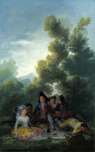 Curator: Here we have Francois Boucher's "The Interrupted Sleep," completed around 1750. The artwork deploys gouache as its primary medium, which allows for subtle tonal gradations and a creamy, almost dreamlike texture. Editor: It makes me feel as if I have just stumbled upon a secret world, perhaps one I am not supposed to be in. The way that Boucher leads my gaze around, slowly revealing his details... the birdcage...the dog sitting at attention. The lovers themselves. I feel I am intruding, which I find titillating. Curator: Titillation, precisely! The compositional structure supports such interpretations. Note how the intertwining branches frame the figures, drawing our eye into the intimate scene. The diagonal orientation of the sleeping woman creates movement. Editor: What do you mean when you say 'movement'? Curator: Consider her posture, and the inclination of the male figure. It generates a visual path that, combined with the vibrant reds in his garment and the floral basket, builds layers into this intricate moment. The materiality here—gouache on canvas—contributes to the Rococo aesthetic, privileging pleasure. Editor: What is wonderful to me, is the complete ease between these two. The intimacy. There is a peace here that invites play, especially between the two figures. Their story has unfolded, is unfolding, and will continue to unfold without our help. We merely witness. We are but naughty voyeurs. Curator: Indeed, Boucher captures a moment suspended in time, echoing pastoral fantasies and idealized eroticism so beloved during that era. But look closely how he manipulates this fantasy through color choices and perspectival techniques. We are not truly drawn "into" this idyllic realm; rather, we are kept at a calculated remove. Editor: Yes...you make an excellent point. But somehow even with my feet rooted firmly in reality, my imagination is still released here. That may be Boucher's most astonishing feat. Curator: Undoubtedly. The complex interplay between surface illusion and underlying formal rigor defines its unique beauty. Editor: And maybe its persistent intrigue too.