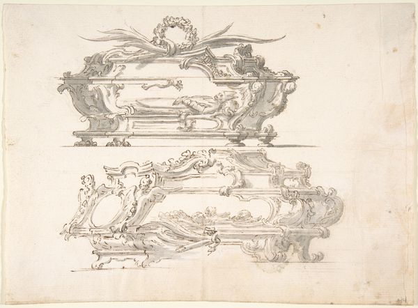 This sheet presents designs for silverware – two servers and an urn – rendered with ink on paper by an anonymous hand. The drawing's medium offers a direct link to the silversmith's craft. These sketched objects were likely intended as proposals for wealthy clients, where the shimmering quality of silver is captured through the precision of line work. Notice how the pen skillfully mimics the material properties of the intended silverware. The flowing lines and delicate flourishes suggest the malleability of the metal, while the intricate details imply the laborious process of shaping and engraving. The designs reveal a fascination with opulence, reflecting the social context of elite consumption. Although these drawings are unsigned, they speak volumes about the labor involved in producing luxury goods, and the artistry required to transform raw materials into objects of desire. By focusing on design and fabrication, we can better appreciate the cultural and economic values embedded within these historical artifacts.