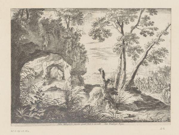 This etching by Johann Christoph Erhard, made sometime in the early nineteenth century, presents a scene dominated by nature's dense textures and subtly contrasting light and shadow. The composition uses an interplay of organic shapes, from the craggy cliff on the left to the full, rounded forms of the trees on the right, which visually encloses the young boy and his goats. Erhard’s intricate use of line work creates a rich surface texture, and this formal aspect speaks to the contemporary interest in landscape and the pastoral. Note how the fine lines of the etching are used to delineate every leaf and stone, giving the scene a sense of depth and detail. The scale of the boy and goats is deliberately small, a technique that emphasizes the grandeur and indifference of the natural world. In this context, the artwork becomes a study in spatial dynamics, where the human figure is integrated into a larger, more complex system. It encourages us to consider how humans perceive and interact with their environment.