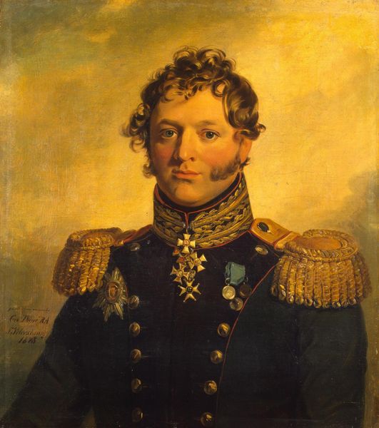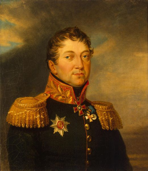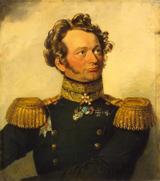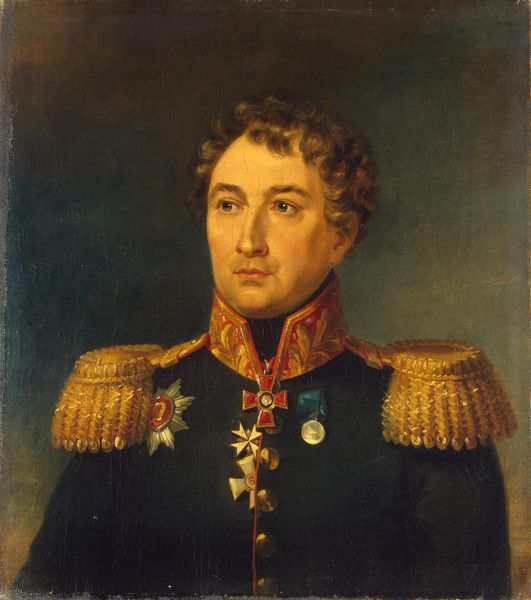Editor: So, here we have George Dawe’s "Portrait of Matvey I. Von Der Pahlen" from 1825, done with oil paint. I’m immediately drawn to the sternness of his expression, especially set against the elaborate details of his uniform. What's your take on this portrait? Curator: This work is deeply embedded in the social and political fabric of its time. Dawe was commissioned to paint portraits of Russian generals who participated in the Napoleonic Wars, and Von Der Pahlen was a significant figure. Consider how these portraits functioned to construct national identity and legitimize power in post-Napoleonic Russia. What do you think the visual language of military portraits like this communicates about masculinity and authority? Editor: I guess the rigid posture and the ornate uniform aim to project an image of strength and control. It seems like they were very intentional about conveying power. Curator: Exactly. And let's consider the social hierarchies reflected here. The medals, the tailoring, it all speaks to privilege and access. Who gets represented in art, and how, is always a political question. Think about what this portrait omits. Whose stories are left out? Where are the images of the common soldiers, the working class, the marginalized populations who also shaped this historical moment? Editor: That makes you wonder about the narratives that are excluded. It really does highlight the power dynamics at play during that period. Curator: Precisely. By critically examining works like this, we can begin to unravel the complexities of history and art’s role in shaping our understanding of it. This has made me consider the limitations inherent to single-perspective narratives, the power structures it subtly reinforces. Editor: I hadn't considered it from that angle, that was a real perspective shift for me. Thanks!