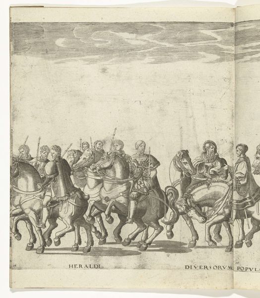 Editor: This is *Vaandeldragers en magistraten, plaat 3*, likely created between 1530 and 1620 by Nicolaas Hogenberg. It's a drawing done with ink on paper, portraying a historical or genre scene. It has a very linear, sketched feel. What do you see in this piece, focusing on the choices of materials and techniques? Curator: Considering Hogenberg’s historical context, the deliberate choice of ink on paper reveals a lot. The accessibility of these materials points towards a wider dissemination of information, diverging from exclusive artistic expression often reserved for the upper class. Notice the emphasis on process: The linear style created by the pen and ink is a stark shift away from painting that takes more time to acquire its final outcome. Editor: So, the very process of production hints at changing social structures? Curator: Exactly. Furthermore, consider the implications of reproducing such imagery. Is this a single, crafted piece? Or potentially an image designed to be transferred onto other surfaces for wider consumption, like textiles or printed pamphlets? The latter possibility raises questions about labor, commodification and the transformation of artistry. Editor: That’s fascinating, I hadn’t considered the potential reproduction of the image. Curator: Right, and this shift diminishes traditional distinctions between high art and popular media by changing how we consider craftmanship. Were they really thinking about elevating production for many, using more efficient methods for their drawings? Editor: It seems to challenge the typical hierarchy of artistic value by emphasizing the role of art as a tool for information sharing. Thinking about Hogenberg’s choices of making opens a window onto the socioeconomic realities of the time! Curator: Yes. Examining production of pieces and art may take time to analyse, but may produce new angles for viewers to find connections to an image.
