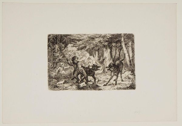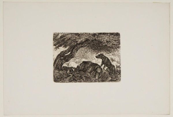Editor: This is Friedrich Anton Wolff’s "Deer Captured by Dogs," housed here at Harvard Art Museums. It has a rather violent energy. What symbols do you notice emerging? Curator: The deer, often a symbol of innocence and vulnerability, is here besieged by dogs, representing instinct and perhaps societal forces. Notice also the architecture in the background. Does it feel like a sanctuary, or a cage? Editor: That's a compelling point! It could symbolize the loss of freedom, a cultural constraint on the natural world. Curator: Indeed, the image's power lies in its potential to evoke the uneasy relationship between humanity and nature, a conflict echoed through centuries. Editor: I'll definitely look at other artwork with the "deer" motif in mind. Thanks! Curator: And I will look again at architectural elements in the backgrounds, and how these change the narrative. Thank you!