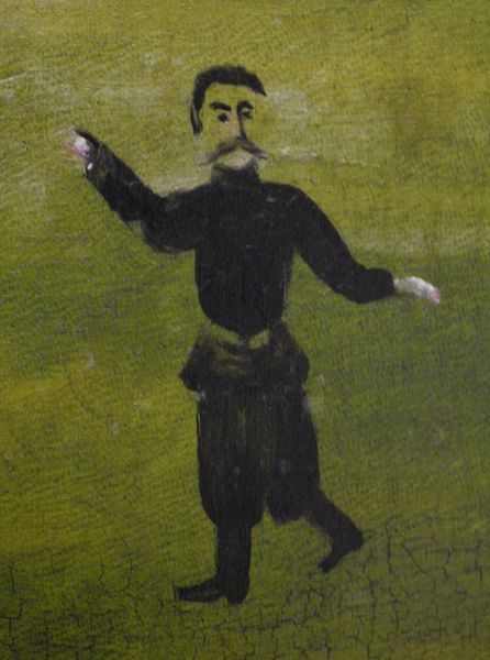 Curator: Ah, yes, Niko Pirosmani’s "Portrait of a Railway Worker (Misha Meheteli)". A very compelling piece rendered in oil paint. What's your first impression? Editor: It’s...oddly touching. There’s something instantly disarming about his gaze and the rather homespun floral wreath around him. Like he’s a gentle giant who also enjoys gardening. Curator: That juxtaposition is quite typical of Pirosmani. The wreath, composed of roses, often symbolizes love and devotion but here, framing a railway worker, it subverts our expectations of traditional portraiture. It pulls together themes of work and romanticism, don't you think? Editor: Absolutely! It also gives me a hint of something else; that worker's portrait has been created as a tribute or gift. I am somehow drawn to it, but also, it seems that something here is somehow incomplete. Maybe, Pirosmani run out of paints to finalize the artwork? Curator: An astute observation! Pirosmani frequently painted on oilcloth or metal, utilizing simple, inexpensive materials. Some would say his raw style actually enhanced the subjects he depicted, imbuing them with a powerful directness. Editor: I agree, the slightly cracked surface of the painting supports a certain vulnerability, like you can touch and instantly feel this particular human being. There is also some sadness. Curator: The lack of precise dating makes contextualizing Pirosmani’s intent somewhat complex, yet these menial jobs were glorified within this portraits and in his artwork in general. But the beauty he saw in the common folk shines through, wouldn't you say? Editor: It does. There is so much sincerity within that simplicity, it resonates! I find myself wanting to know the railway worker and the artist that depicted him. Curator: An artwork that asks for familiarity then? Maybe its purpose is, exactly to make us wonder. Editor: Most definitely. And question what truly constitutes worth and beauty. Thanks for showing this artwork, that humble but moving portrait.