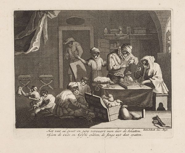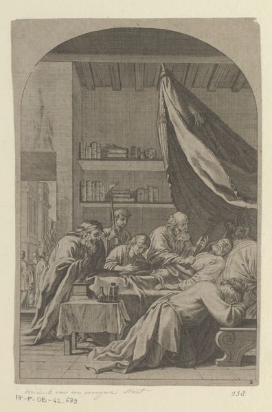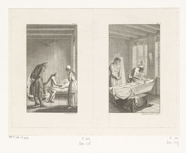 Daniel Nikolaus Chodowiecki created this etching, "Gertrude at the Deathbed of Catharina," a poignant domestic scene rendered through the meticulous technique of engraving. The network of fine lines, etched into a metal plate and then printed, creates a remarkable level of detail. Look at the textures he renders: the rough-hewn beams of the house, the folds of the mourners' clothes, the frail figure in the bed. Chodowiecki was a master of this reproductive medium, which was central to the Enlightenment's project of disseminating information and ideas. Etchings such as this one brought moralizing narratives into the homes of a broad public. The image speaks to the social fabric of 18th-century life. Death was a communal event, managed within the household rather than in sterile medical settings. The very act of etching, with its capacity for replication, mirrors this broader social imperative. It democratizes access to both art and the values it represents. The amount of work that went into the creation of this image also reminds us of the amount of work that went into creating a society.