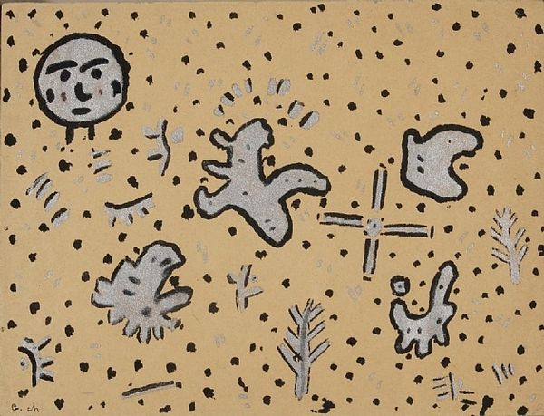 Joaquim Rodrigo made this painting, Muro - Nuvem Verde, with oil on canvas, though the date is unknown. The overall effect of the ochre ground is almost like a fresco, giving the impression of something elemental, maybe primitive. The textures and the marks are very visible, you can really see the hand of the artist in the application. There’s a wonderful dance between figuration and abstraction, the painting is not just a depiction, but an event. Look at how the red of the human figure, outlined in white, mirrors the red in the arrow shape pointing towards the text ‘Nuvem Verde’ as the red chickens scratch around below. It is almost like a comic strip. There is a real playfulness that reminds me a little of the work of Joan Miró. Like Miró, Rodrigo prompts us to consider art not just as a window onto the world, but as a space where our imaginations can take flight, where meaning is multiple and never quite fixed.