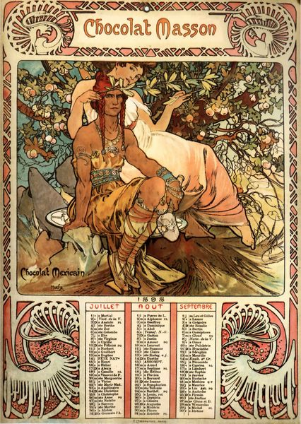 Curator: This is Walter Crane's "Spain Conquered," a painting dating back to 1893. It's a potent visual statement, deeply embedded in the art nouveau and Orientalist styles popular at the time. Editor: Oh, wow, the symbolism hits you right away, doesn’t it? There’s almost a theatrical, slightly tragic feel to the whole piece, with that knight looming and that vulnerable, idealized native figure gazing up… It's definitely stirring something in me. Curator: Absolutely. Crane uses allegory here to examine the colonial narrative. Notice how he contrasts the fully armored Spanish conquistador with the seminude indigenous woman who sits amidst conquered arms and the fallen standards. It speaks to power dynamics and the imposition of European culture upon the so-called "New World." Editor: And that art nouveau border just frames everything so deliberately, making it all feel almost…designed? The colors, even, are used symbolically, the reds so prominent... and the whole setting feels staged. The mirror she is holding adds an interesting aspect, because is she seeing herself, or Europe's projection of what she should be? Is that reflection what's really conquered here? Curator: That's astute. Crane often used such framing devices and vibrant colors to create a dialogue between beauty and message. The inclusion of the mirror does prompt us to reflect on perception and perhaps even question whose story is truly being told. Editor: You know, it almost feels like he’s setting up a critique of imperialism right in the middle of what seems like just a romanticized history scene, doesn't it? The vulnerability of that woman just jumps out, even with the lush romanticized backdrop. It's complicated. Curator: Indeed, it is. Crane, influenced by socialist ideals, often used his art to comment on social inequalities and the ethics of power. “Spain Conquered,” with its potent imagery and suggestive composition, can be understood as one of these critiques within the fin-de-siecle cultural landscape. Editor: Makes me think about how images like these helped build the stories we tell about conquest even now, all through romantic visions that kinda gloss over what's really going on. I can see myself coming back to this work and feeling a little different about it each time, noticing things that resonate with the day. Curator: Precisely. This piece serves as a reminder that images from the past are not simply historical documents; they continue to shape our present understanding of power and identity.