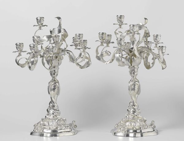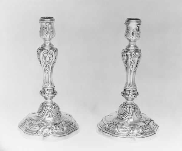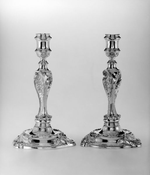 Curator: These silver candlesticks by George Wickes at the Harvard Art Museums are, well, aggressively ornamental. Editor: They almost look alive, like fancy metal plants reaching for the light. Curator: The ornate detail feels very much of Wickes' era. I imagine flickering light dancing across all those curves. The sheer density of rococo detailing, the chasing and the casting... Editor: A dance of light and shadow, certainly. Though, I find myself thinking about the weight of such elaborate forms. Do you feel it echoes the weight of courtly life back then? Curator: Perhaps. Or maybe Wickes was just having a bit too much fun with silver. Either way, these candlesticks leave quite an impression. Editor: Indeed. They invite us to not just see, but to feel the opulence.