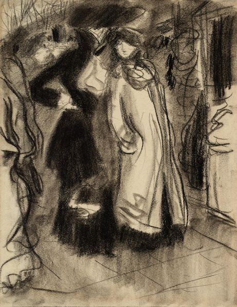 Editor: Henri de Toulouse-Lautrec's "Artillerman and Girl," created around 1886, renders a rather peculiar scene with watercolors on paper. It's stark, almost confrontational, especially with the subjects' gaze. How should we interpret this ambiguous dynamic, in your view? Curator: It's easy to get caught up in the "who is who" when viewing this, but let's step back and consider Toulouse-Lautrec's world. Think about the Parisian social scene, the cabarets, the military presence—it's a world of class tensions, emerging consumer culture, and gendered expectations. So, how might the artist be engaging with these tensions? Does the depiction subtly reinforce or perhaps critique them? Editor: That’s interesting, I hadn’t thought of it in relation to consumer culture. The subjects seem somewhat detached, and it reflects back on the socio-political contexts of that era. It makes me wonder about his intentions regarding their representation. Curator: Precisely! Lautrec was moving in circles that included both the bohemian underbelly and the aristocracy. What commentary might he be making about power dynamics? About who has the right to look, to judge, to be portrayed? The loose brushstrokes, almost like glimpses, also speak to a certain voyeurism. Editor: That rings true. Perhaps it’s about the fleeting nature of encounters within that world? The incomplete nature of the image reflects the transient experiences they portray? Curator: Exactly. This wasn't just a portrait; it was a statement. This artwork encourages us to reconsider our assumptions about portraiture and the society it reflects. We must consider the historical factors surrounding Lautrec and his world to help understand how this fits into those conversations. Editor: Thinking about art in its social and historical context opens up a completely different understanding of this image!
