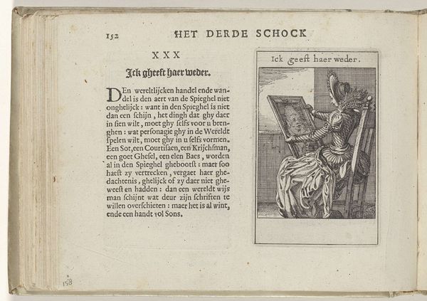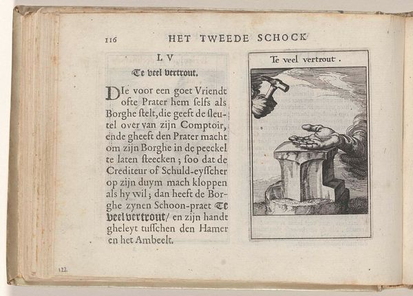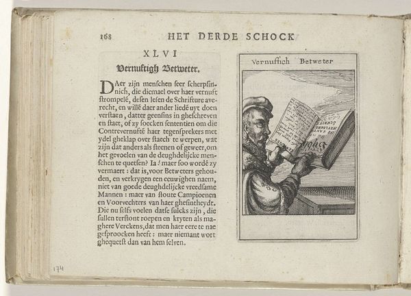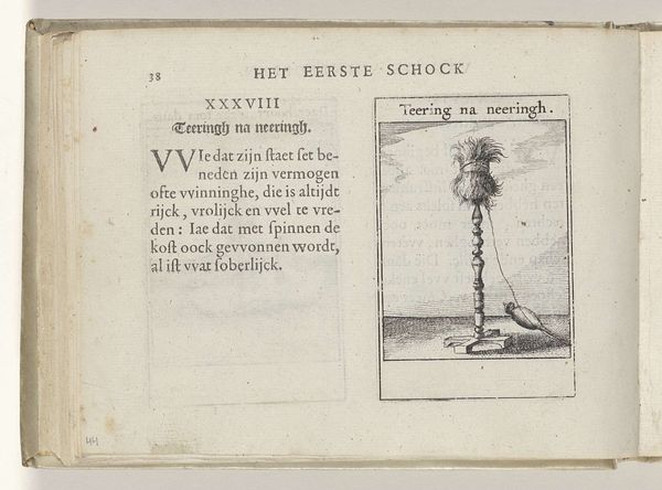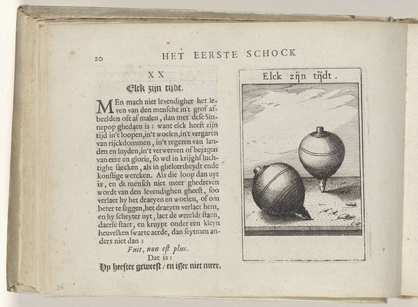 Editor: So, this engraving, "XXX Kruijt voor de wilde woeste," made in 1614 by Roemer Visscher. It looks like an open book, and on one of the pages, a depiction of books stacked on each other. There’s a somewhat somber, almost grave, feeling to the image, I think? What strikes you most when you look at it? Curator: The most striking thing to me is the potential tension between the power of knowledge contained within these books, and their vulnerability. Consider the sociopolitical context of the Dutch Golden Age – a period of immense intellectual flourishing alongside brutal colonial expansion. Is Visscher perhaps inviting us to consider how easily intellectualism can become a tool of oppression, a "herb for the wild, savage," as the title suggests, used to cultivate a specific kind of order? Who benefits from this cultivated order, and who is excluded or violently repressed in its name? Editor: That's an interesting way to put it, framing the image in terms of potential violence within society, not as wisdom bringing civilization, but civilization through violent cultivation. It makes me see it less as celebrating learning, and more as interrogating the potential darker implications of intellectual pursuits, a tool for domination rather than enlightenment. Curator: Precisely. Think about the visual language used here. The books aren’t neatly organized, they're piled haphazardly. The text references Plato, Aristotle, Seneca. Is Visscher commenting on the weight and potential chaos of inherited philosophical tradition when removed from real-world problems? Who had access to these ideas, and how did they influence society in practical terms, especially with regards to gender or racial inequalities? Editor: So, you're saying that the artwork’s true meaning only appears once we recognize it's embedded in social struggles, raising questions about access, oppression, and who gets to define “civilization” to begin with. Curator: Exactly! By questioning those in power through this artwork, can start looking closer into its intersectional implications for current gender, race and political theories.