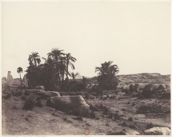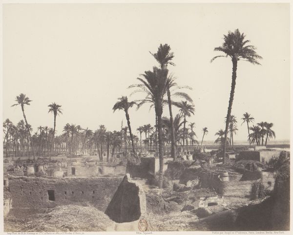 Editor: So, this is Félix Teynard's "Esneh, Dattiers, Sycomore et Café Sur le Bord du Nil" from around 1851-1852. It’s a daguerreotype, which is an early photographic process, right? It has this wonderfully serene feel. The large tree seems almost protective. What do you see in this piece, considering it's not just a landscape? Curator: Beyond its aesthetic qualities, consider the symbolism embedded within. The date palm, the "dattiers", has ancient associations with life and fertility in many cultures, from the Near East to North Africa. The Sycamore tree, too, carries powerful resonance, often linked to ideas of strength and longevity, not unlike a Bodhi tree. What do these choices, carefully composed, suggest to you about Teynard's intentions? Editor: Hmmm... Intentions. Well, I initially just saw a nice, peaceful scene, but with your comments about date palms being linked to fertility and the Sycamore linked to strength and longevity, I guess he’s saying something more. Do you think he was romanticizing Egyptian culture for a European audience? Curator: The gaze of early photography in this region cannot be divorced from its socio-political context. How much of Teynard's work is a recording, and how much a construction for a Western audience keen to consume exoticized imagery? The “cafe” included in the title, the specific staging…it speaks to Orientalist trends and cultural appropriation in the arts. The ruins of the village become a stage, the residents mere players. Editor: I didn’t consider that. The framing is really interesting now, with all that history in mind. It changes the whole dynamic of the image. I see a kind of visual record filtered through European eyes. Curator: Exactly. And, that intersection - the visible, historical symbols viewed through a colonizing lens – makes it incredibly compelling for a study of both art and cultural memory. Editor: Well, this has certainly given me a lot to think about! I came for art, and discovered an amazing study of power.