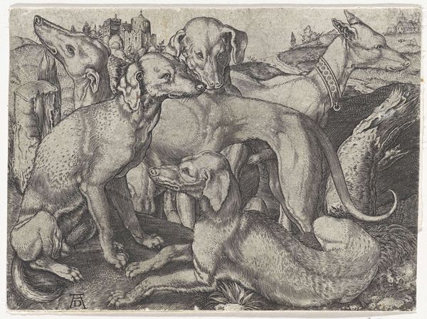 Editor: Here we have "Hunting Dogs Attacking a Deer" by Léon Davent, dating from 1540 to 1556. It's an engraving, so a print. It's such a violent image, but also very dynamic. What strikes you about this piece? Curator: Its depiction of violence certainly reflects the socio-political structures of the Renaissance. Hunting, particularly for deer, was a privilege of the aristocracy, visually asserting dominance not just over nature, but also reflecting their hierarchical control over society. Editor: So the hunt is more than just putting food on the table? Curator: Exactly. Consider the distribution of this print. Who would have owned it? Who would have commissioned it? Probably members of the upper class, solidifying their own status through ownership of such imagery. The image then serves as propaganda, of sorts. It also invites contemplation about who can exert such force over the natural world. Notice the detail in the dogs versus the more generalized landscape in the background, implying a certain hierarchy even in the visual elements. What does that suggest to you? Editor: It seems the focus is really on the power and drama of the hunt itself. The setting feels secondary. I hadn't considered how the mere act of depicting the hunt itself bolstered the societal position of the elite. Curator: And consider how this image may have been displayed, reinforcing that power to viewers within their social circles. That contextual understanding is essential to understanding Renaissance art beyond just aesthetics. Editor: I hadn’t thought about it like that. Now I see the image functioning as part of a bigger cultural narrative.