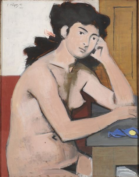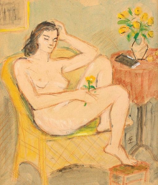 Editor: Here we have Henri Matisse’s “Nude in an Armchair," painted in 1920. It's an oil on canvas, and I find it incredibly intimate, almost melancholic in its quietness. What do you see in this piece, especially considering its historical context? Curator: It's fascinating to consider Matisse, often celebrated for his joyful colour, engaging with the nude in this period, shortly after the First World War. How do you read the sitter's pose and the composition itself in light of the profound social and psychological shifts of the time? Does it perhaps reflect a sense of vulnerability or introspection following immense trauma? Editor: I see what you mean. The slightly muted palette and the woman’s introspective gaze do suggest a post-war mood. Was Matisse, known for Fauvism’s vibrancy, intentionally moving away from that? Curator: Exactly! We need to consider the societal expectations and limitations placed on women in the 1920s alongside the rise of modernist art. Matisse’s portrayal challenges both academic traditions and conventional notions of female beauty. It almost seems to me like he is consciously negotiating this complicated space, making a comment on objectification by revealing an individual rather than a mere muse. What do you think of that interpretation? Editor: I think it's really interesting how you tie it back to the woman’s identity and the societal pressures of the time. I hadn't thought about it that way. Curator: It reveals how studying art isn’t just about looking; it's also about understanding the historical and social framework in which artists worked, in order to uncover these deeper intersectional narratives. It forces us to reconsider not only what we are seeing, but what we’ve been conditioned *to* see. Editor: This makes me want to look at all nudes from this perspective. Thanks!
