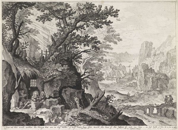 Johann Sadeler I created "Heilige Beatus als kluizenaar" – or Saint Beatus as a Hermit - with engraving techniques sometime between 1550 and 1601. The work presents a meticulously detailed landscape split between the dark, intimate foreground and a bright, expansive vista. This contrast draws our eye across the composition. Sadeler's precise lines create a rich texture, defining forms from the saint’s robes to the rugged mountains. Note how the composition is structured around opposing elements: the solemn figure of Saint Beatus in prayer before a makeshift crucifix, set against a dragon. This juxtaposition sets up a symbolic dialectic between spiritual devotion and earthly challenges. The detailed rendering of the natural environment isn't just a backdrop, but an active participant in the narrative, reflecting the saint's internal struggle and spiritual quest. Sadeler challenges us to consider the interplay between the individual and their environment. This engraving isn't merely a depiction, but an invitation to contemplate the deeper structures of faith, isolation, and transformation.