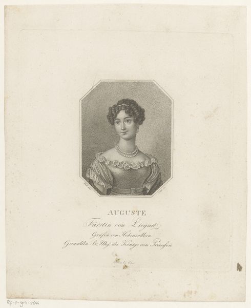 Friedrich Wilhelm Meyer created this engraving of Elisabeth Ludovika of Bavaria, Queen of Prussia. The composition centres on a portrait enclosed within an octagonal frame, immediately drawing our attention. Meyer employs delicate, precise lines to sculpt the queen's features. The formal structure of the print, with its emphasis on symmetry and geometric shapes, evokes the Neoclassical movement's desire for order and reason. The octagonal border acts as a boundary, framing and isolating the subject within a distinct space. Meyer uses hatching and stippling to render the tonal variations and textures of the queen's dress and hair. The print captures the subtle nuances of light and shadow, giving a sense of depth and volume. The print's medium and technique play a crucial role in shaping its meaning. The precision and detail of the engraving process speak to a desire for accuracy and objectivity, reflecting the era's fascination with scientific observation and documentation.