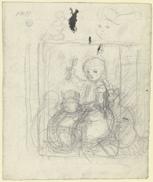 Curator: This delicate drawing, entitled "Twee baby's," which translates to "Two Babies," was sketched by George Hendrik Breitner around 1883-1885. You can find this intimate work currently held at the Rijksmuseum. It’s a quick pencil rendering, characteristic of his sketchbooks. Editor: It strikes me as melancholic, despite the subject. There's something about the soft, smudged lines and the slightly forlorn expression of the baby in the foreground that evokes a sense of vulnerability and perhaps even loss. It certainly defies expectations about sentimental depictions of children, wouldn't you say? Curator: Absolutely. Breitner was deeply invested in capturing the reality of everyday life, steering clear of idealized representations. Think about the social context: Breitner's Amsterdam was a city undergoing rapid industrialization. These sketches could offer a glimpse into the lives of ordinary people. Editor: And perhaps an awareness of infant mortality rates during that era. The sketch certainly captures the precariousness of life. The incomplete lines, the way the background baby is almost faded – it speaks to fleeting moments and fragile existence. We should remember also that the artist was part of an emerging group that tried to picture life and not construct idealized scenes, such as in Academic art. Curator: Precisely. Furthermore, his approach challenges the traditional, often sentimental, depiction of children in art, seen through the lens of prevailing social and artistic conventions. Editor: Considering it's a quick sketch, there is still this depth and emotion that surpasses many meticulously rendered portraits of the time. It makes me wonder about Breitner’s relationship with his subject, or perhaps even the symbolism he attributed to the image of a child. How would this piece be seen today, through the lenses of commodification of children images? Curator: A valid point, highlighting the contextual shifts and ethical questions arising across time. Breitner's sketch, now presented within a museum framework, enables a modern audience to consider and critically debate its historical origins and relevance. Editor: Yes. It reveals that even an artist’s fleeting impression holds the potential to speak volumes about societal values and individual experience, but more than anything, what it meant for that artist, that period in time. Curator: It prompts us to look beyond mere representation and actively engage with art as a vehicle for empathy and dialogue about pressing social realities.